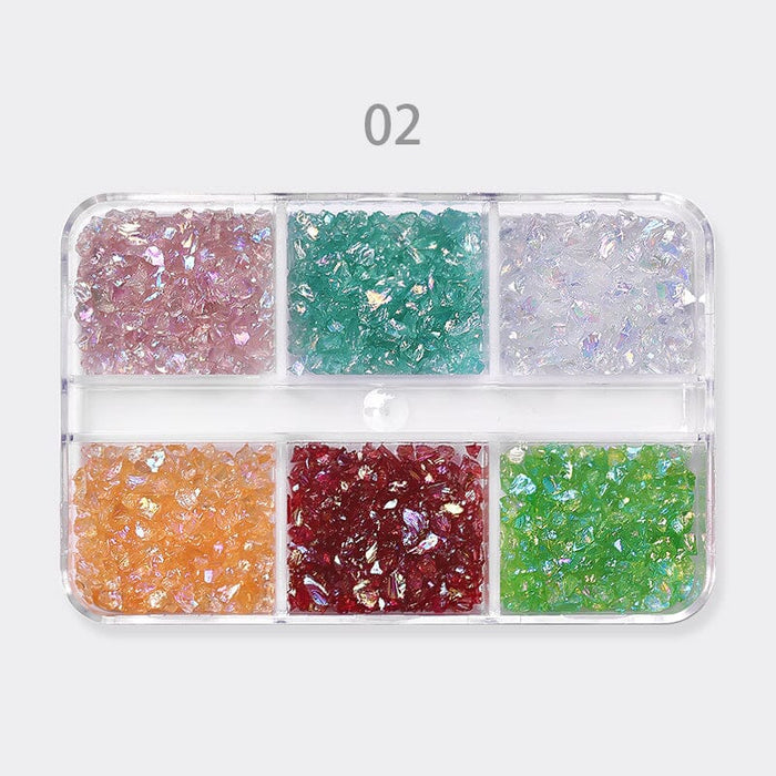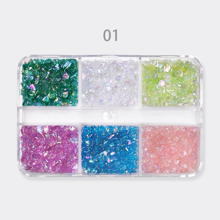 Unleash your creativity with our 6 Grids Mixed Color Ice Transparent Nail Decorations. This exquisite collection features a stunning array of ice-transparent decorations in various colors, perfect for adding a touch of shimmering elegance to your nail art. Ideal for both professionals and DIY enthusiasts, these decorations will elevate your manicure to a new level of sophistication.