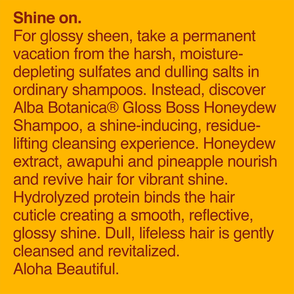 Alba Botanica Gloss Boss Honeydew Shampoo gently cleanses hair, washing away dirt, grime, oils, and styling residue. It leaves hair smooth, reflective, and with an all-day high gloss shine.