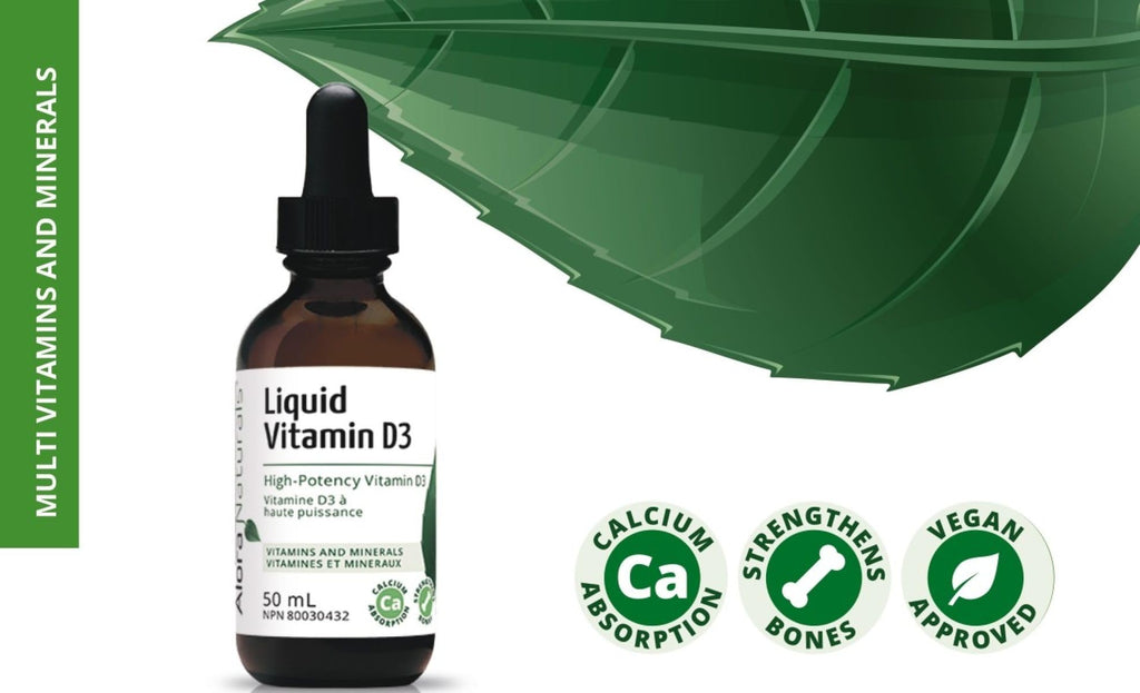 Alora Naturals Liquid Vitamin D3 (50ml) is a high-potency, vegan-friendly liquid supplement delivering 1000 IU of Vitamin D3 (cholecalciferol) per serving. This essential nutrient supports immune health, strengthens bones and joints, and aids in effective calcium absorption. Free from gluten, dairy, soy, GMOs, and artificial additives, this clean and convenient liquid formula is ideal for individuals with low sun exposure, plant-based lifestyles, or those who prefer a hassle-free alternative to pills or tablets. NPN 80030432