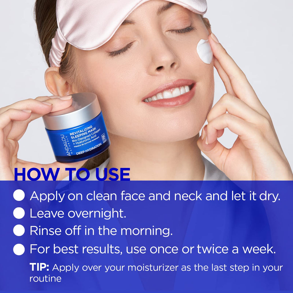 Andalou Naturals Revitalizing Sleeping Mask is an overnight treatment designed to deeply hydrate, plump, and restore the skin while you sleep. Enriched with Bio-Designed Collagen, Hyaluronic Acid, and Ceramides, it helps improve skin elasticity, protect against environmental stressors, and boost overall radiance. Infused with relaxing Jasmine Oil, it soothes the senses, providing a calming and restorative nighttime skincare experience.