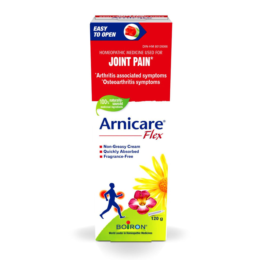 Boiron Arnicare Flex is a homeopathic cream formulated for the relief of joint pain, including symptoms associated with arthritis, osteoarthritis, minor sprains, and strains. Made with 100% naturally sourced Arnica montana and Harpagophytum, this light, non-greasy cream absorbs quickly for convenient pain relief. Free from NSAIDs, menthol, camphor, and fragrance, it is suitable for adult use and gentle on the skin.