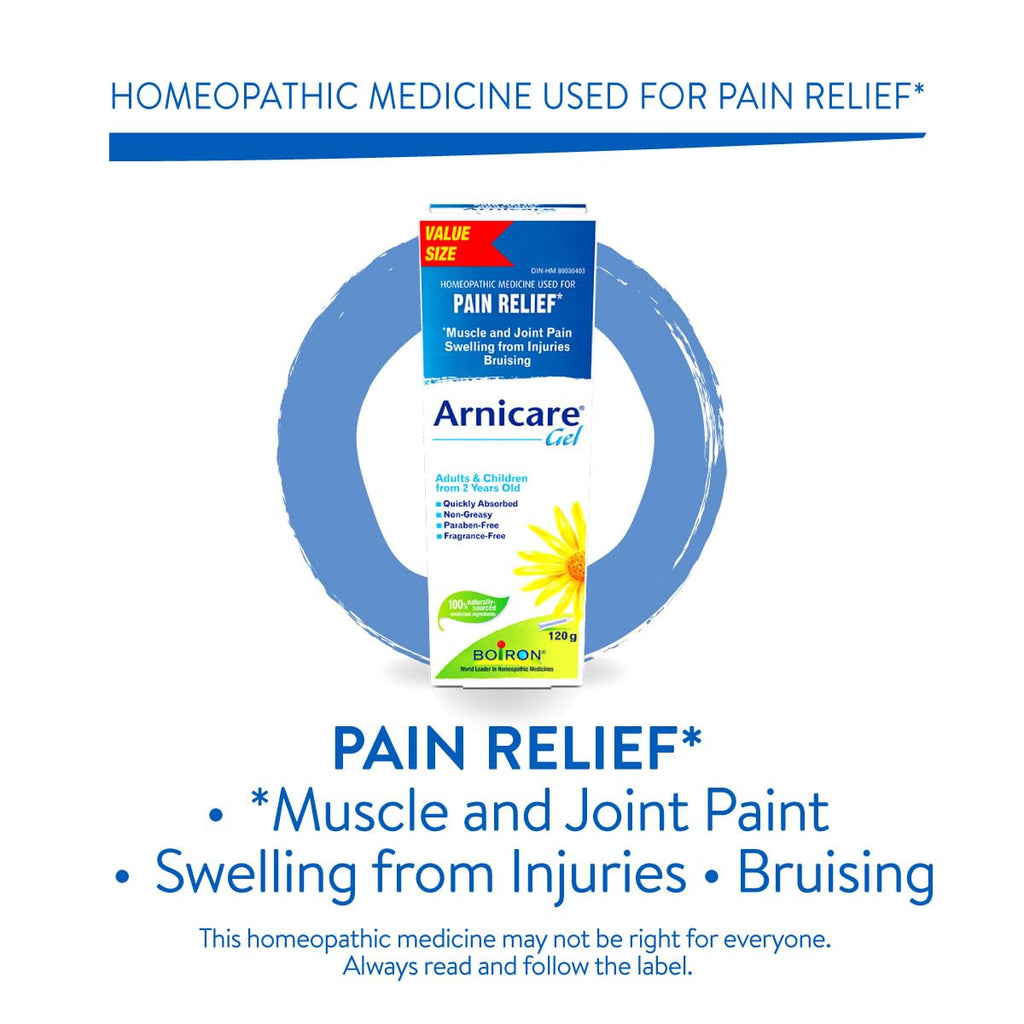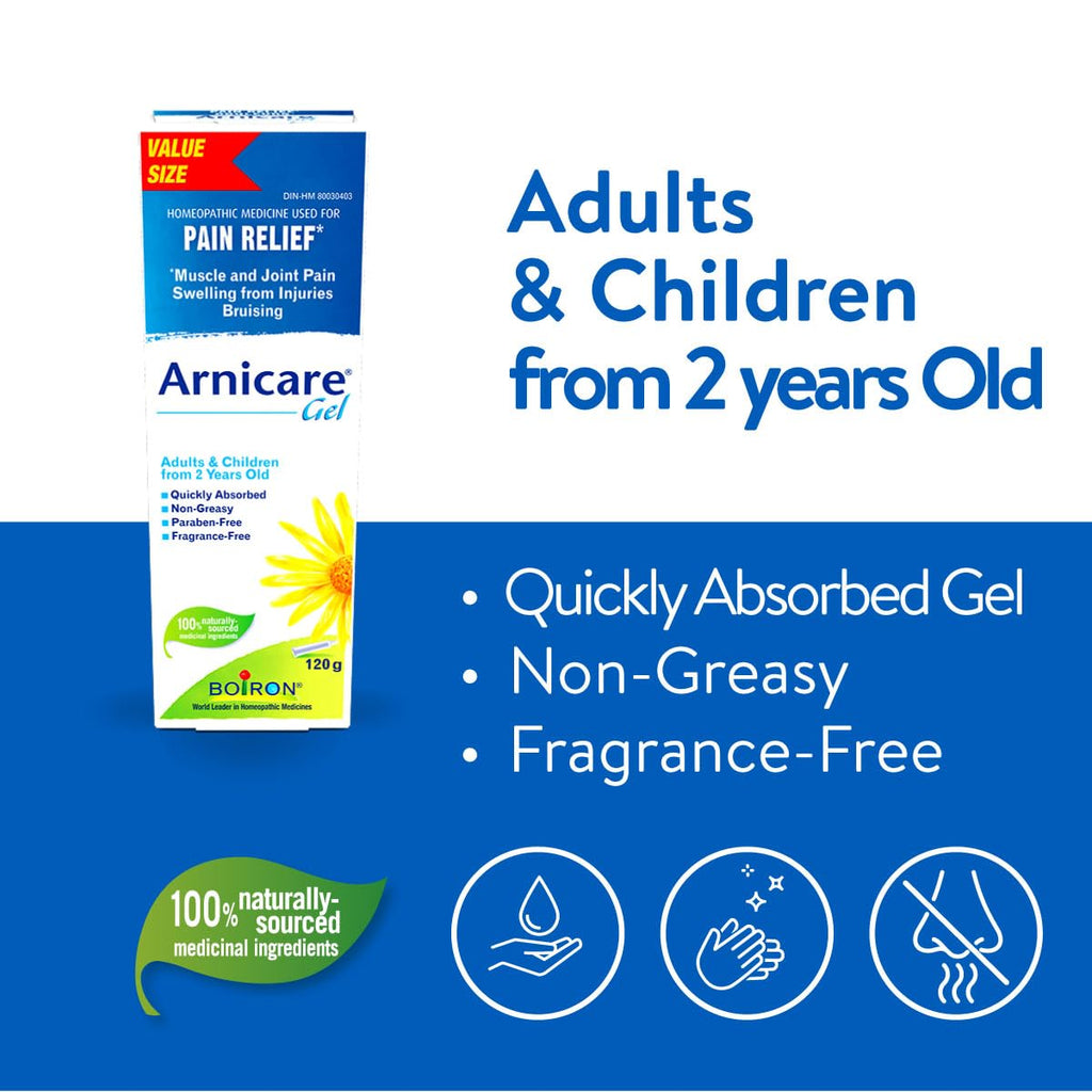Boiron Arnicare Gel Value Pack (120 g) offers natural, homeopathic relief for muscle pain, joint pain, bruising, and inflammatory oedema caused by falls, blows, blunt injuries, or surgery. Formulated with 100% naturally sourced medicinal ingredients including Arnica Montana, this non-greasy gel absorbs quickly into the skin without leaving residue. Suitable for adults and children from 2 years old, it provides effective localized relief and can be used alongside oral Arnicare Tablets for enhanced results.