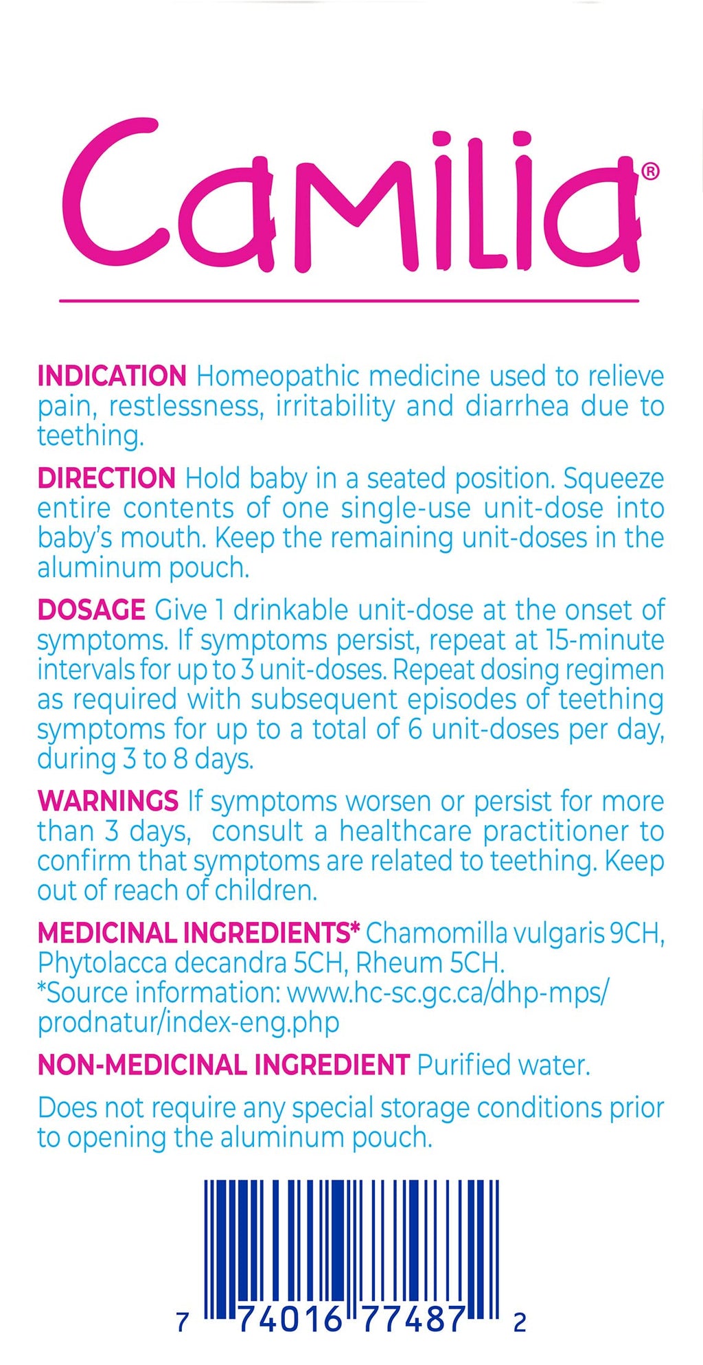 Boiron Camilia Baby Teething Relief is a homeopathic medicine designed to relieve pain, restlessness, irritability, and diarrhea associated with teething in babies and toddlers aged 1–30 months. Benzocaine-free, preservative-free, sugar-free, and dye-free, Camilia provides a gentle and effective solution for teething discomfort. Each unit-dose is packaged in a sterile aluminum pouch for convenient, on-the-go use.