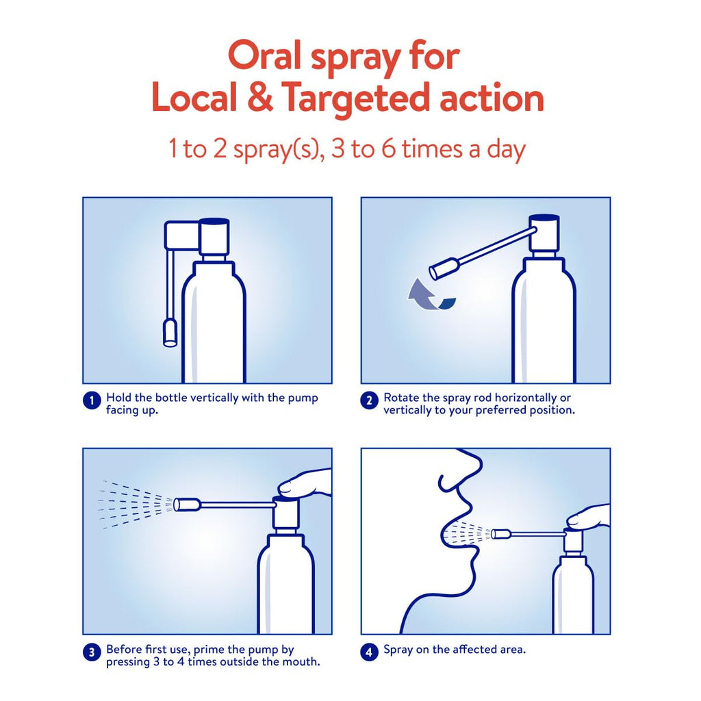 - Throat spray for relief of sore throat, local irritation, and mouth ulcers