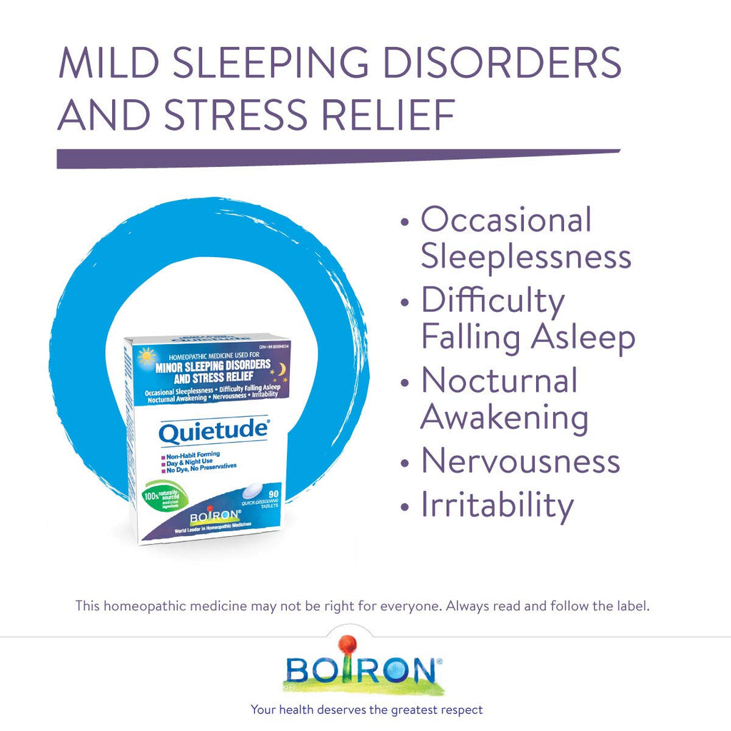 Boiron Quietude is a homeopathic medicine designed to support restful sleep and relieve minor sleep disturbances such as restlessness, difficulty falling asleep, nocturnal awakening, and occasional sleeplessness. It also helps manage nervousness, including hypersensitivity and irritability. Suitable for adults and children from 6 years old, Quietude is non-habit forming and made with 100% naturally-sourced medicinal ingredients.