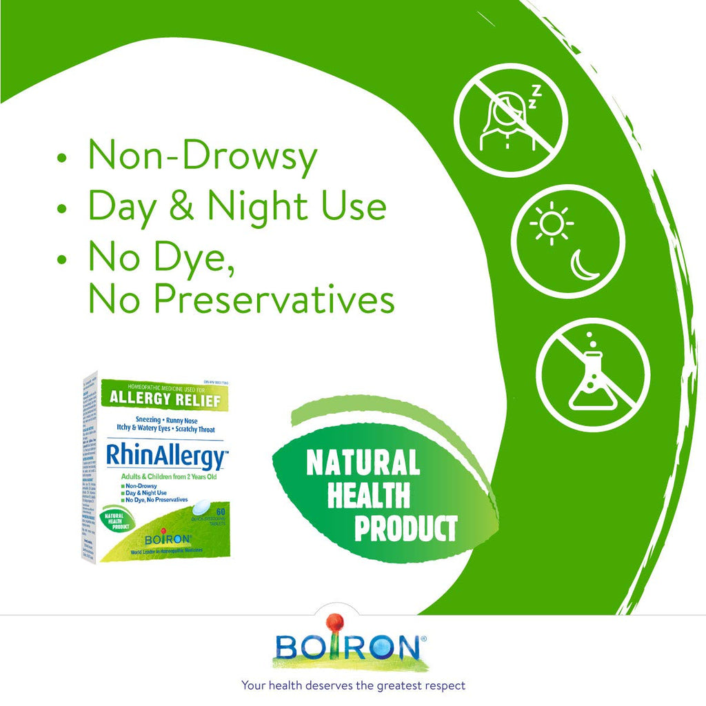 Boiron RhinAllergy is a homeopathic medicine designed to relieve allergy symptoms caused by seasonal and environmental allergens, including sneezing, runny nose, itchy or watery eyes, and scratchy throat. This non-drowsy, antihistamine-free, and pseudoephedrine-free formula comes in quick-dissolving tablets that are easy to take without water. Suitable for adults and children from 2 years old.