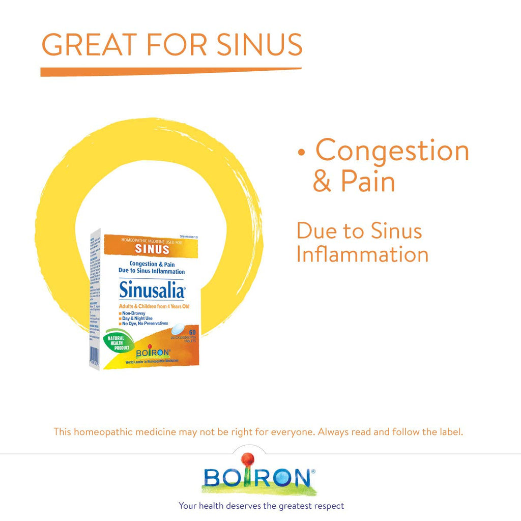 Boiron Sinusalia is a homeopathic medicine designed to relieve nasal congestion, facial pain, and pressure caused by sinus inflammation. Non-drowsy and fast-dissolving, these tablets are suitable for children aged 4 years and older as well as adults. Ideal for cold and allergy seasons, Sinusalia provides quick relief and supports natural wellness for the whole family. Manufactured by Boiron, a trusted homeopathy brand since 1932, this remedy ensures high-quality, safe care when used as directed.