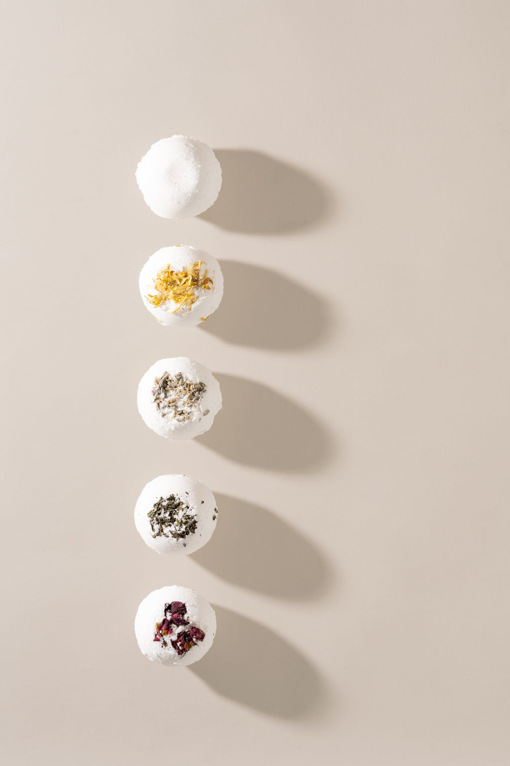 Includes one bath bomb of each fragrance: camomile, lavender & sweet orange, peppermint & eucalyptus, lily of the valley, and rose & ylang ylang