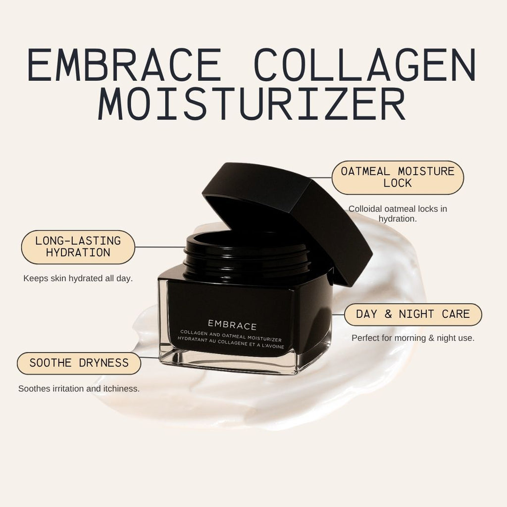 Embrace Collagen Moisturizer deeply hydrates, soothes, and restores skin with collagen, oatmeal, and vitamin E. This lightweight, non-greasy formula locks in moisture, improves elasticity, and nourishes for a softer, smoother, and radiant complexion. Ideal for both day and night use.
