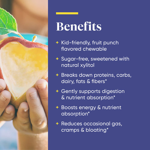 Enzymedica Kids Digest 60 Chewables provides gentle, kid-friendly digestive support in a fruit punch-flavored, sugar-free chewable.* Powered by Thera-blend™ enzymes, this formula helps break down fat, fiber, protein, and carbohydrates to support nutrient absorption, boost energy, and reduce occasional gas, cramps, and bloating.* Ideal for children who need extra digestive support while ensuring they get the most from the foods they eat.*