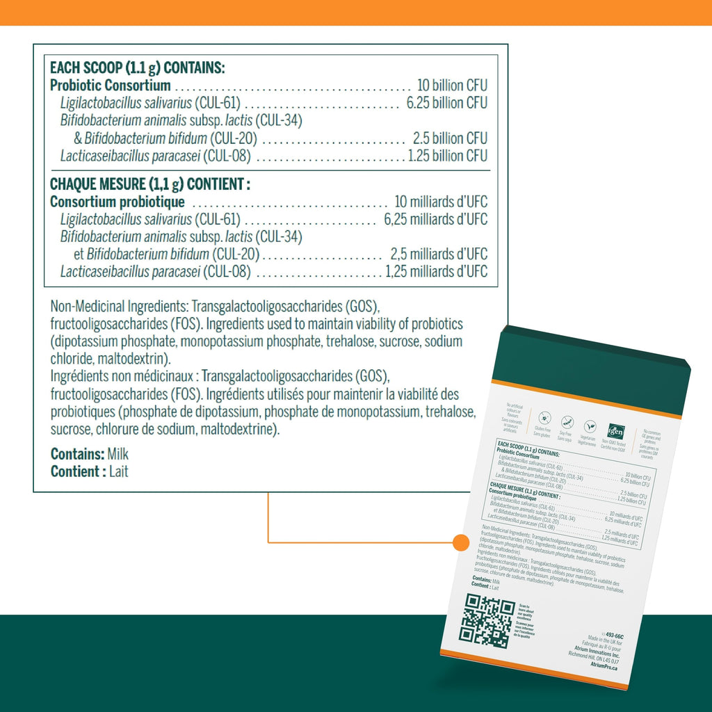 Dosage: Children (1–4 years): Add 1 scoop to a glass of milk, formula, or water and mix. Take once daily with a meal, at least 2–3 hours before or after antibiotics, or as recommended by a healthcare practitioner