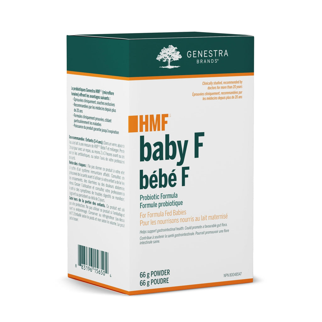 Genestra Brands HMF Baby F is a probiotic powder specially designed for formula-fed babies aged 1 to 4 years. Each daily dose provides 10 billion CFU of beneficial bacteria along with prebiotic fibers, fructooligosaccharides (FOS) and transgalactooligosaccharides (GOS), which mimic the oligosaccharides naturally found in breast milk. This combination supports gastrointestinal health, promotes a favorable gut flora, and helps maintain a balanced intestinal microflora for overall digestive wellness. The powder dissolves easily in milk, formula, or water, making it convenient for daily administration. This product is non-GMO, gluten-free, soy-free, and vegetarian.