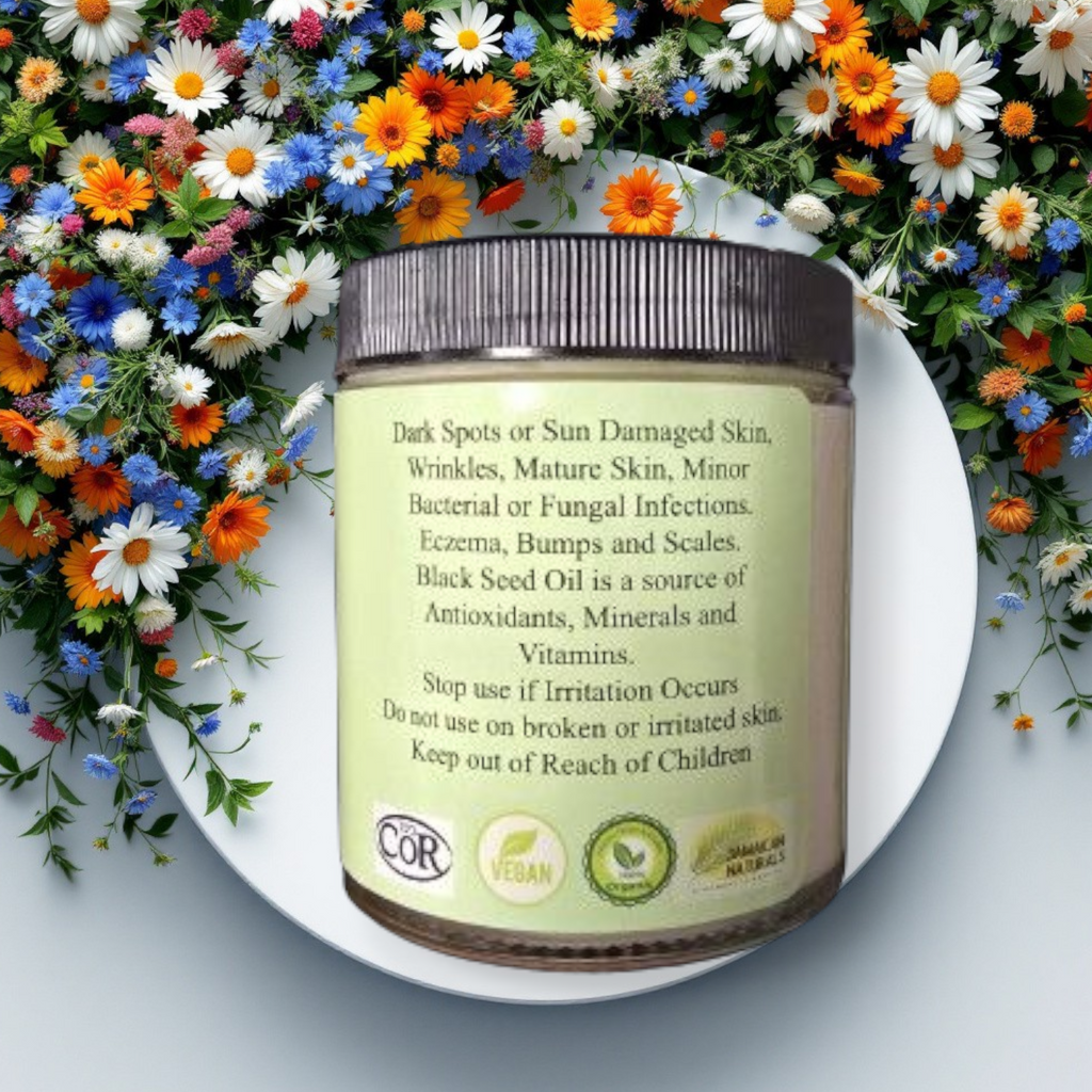 Experience luxurious, long-lasting hydration with this Restorative Body Butter, crafted from a rich blend of pure Kukum, Shea, Jojoba, and Cocoa Butters, complemented by Jojoba Oil, Black Cumin Seed Oil, Vanilla, and Vitamin E. This deeply nourishing formula softens, smooths, and comforts the skin while offering a soothing, non-greasy feel with fast absorption for instantly rejuvenated skin. Black Cumin Seed—rich in B-vitamins and renowned for its strengthening and antioxidant properties—helps calm dryness, reduce irritation, and support a healthy skin barrier. Versatile in nature, Black Cumin Seed Oil is also traditionally known to support hair health and may help with concerns like hair fall.