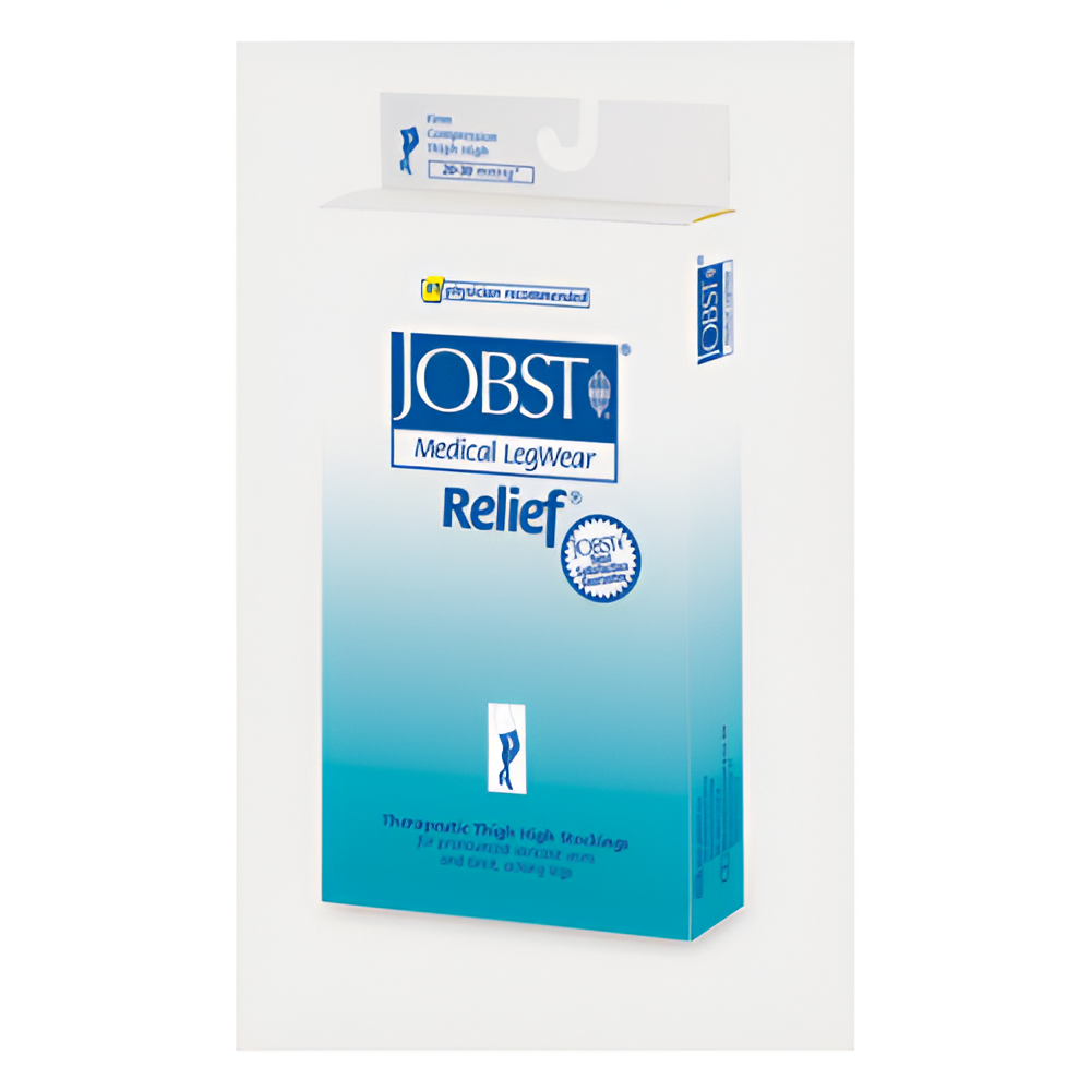 The Jobst Relief Thigh-High 20-30 mmHg Beige compression stockings provide therapeutic support to improve blood circulation, reduce swelling, and manage varicose veins, edema, and other circulatory issues. Designed with a thigh-high length, these stockings ensure full-leg coverage for consistent and effective compression. The soft, durable fabric ensures comfort for all-day wear, while the neutral beige color provides a discreet and professional appearance. Ideal for daily use, these stockings combine functionality, comfort, and durability for effective venous therapy.