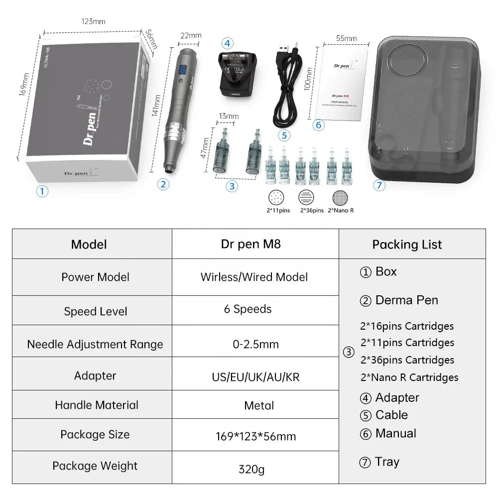 Unlock youthful, radiant skin with the M8W Dr. Pen, a state-of-the-art microneedling device designed for professional-quality results at home or in clinics. Using advanced microneedling technology, it creates precise micro-channels in the skin, stimulating collagen and elastin production to reduce fine lines, wrinkles, acne scars, and improve overall skin texture and tone. With fully adjustable needle depths and multiple speed settings, the M8W Dr. Pen allows for personalized treatments that address specific skin concerns, delivering safe, effective, and non-invasive results.