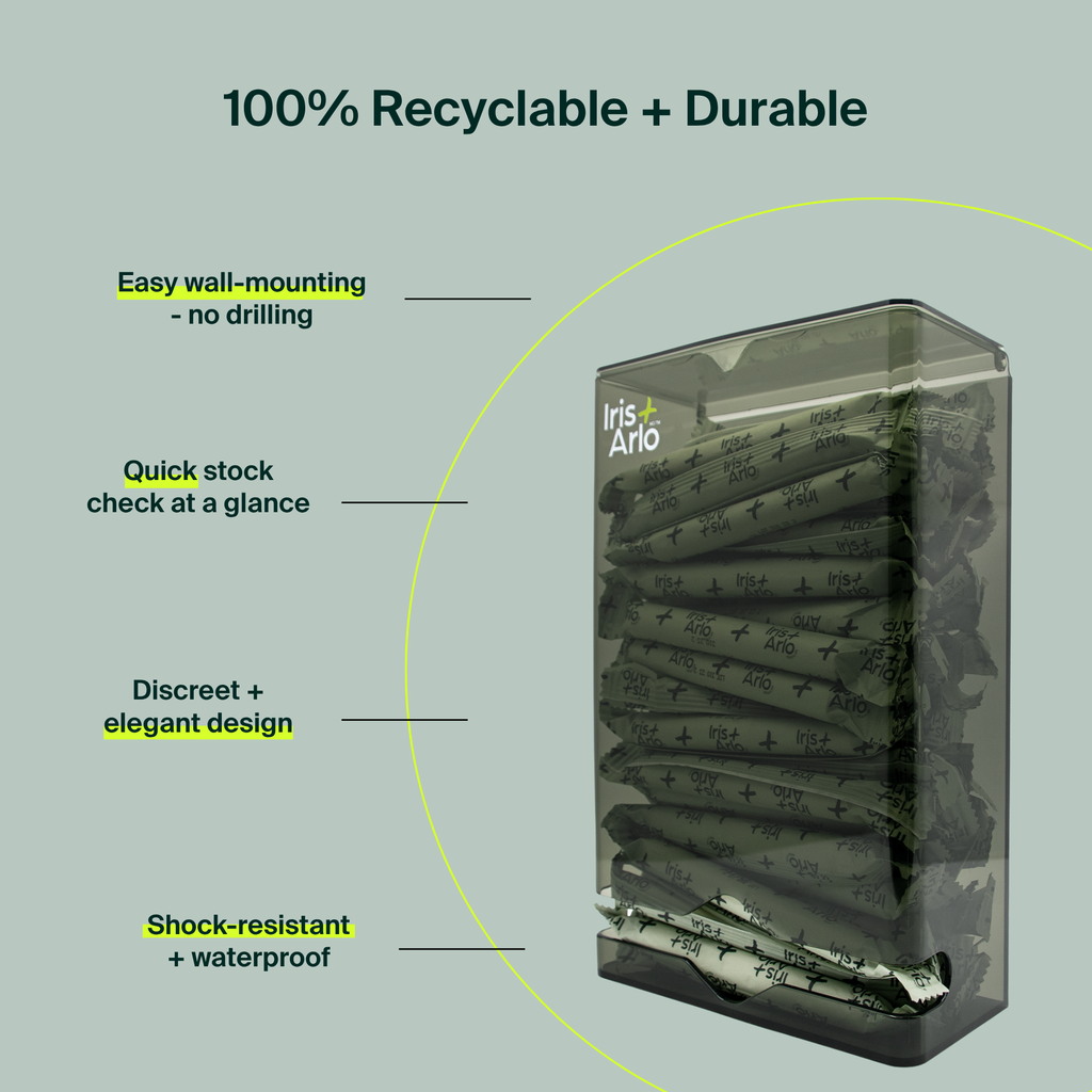 APPLICATOR TAMPONS AREN'T INCLUDED IN THE PRICE. Featuring a sleek and clean design, our tampon dispensers are sturdy, eco-friendly products that contribute to the circular economy. With greater storage capacity than standard cabin dispensers, they are perfect for washrooms serving more employees or organizations looking to extend refill intervals. Choose the trio to provide more options for your staff and save on the complete set of dispensers.