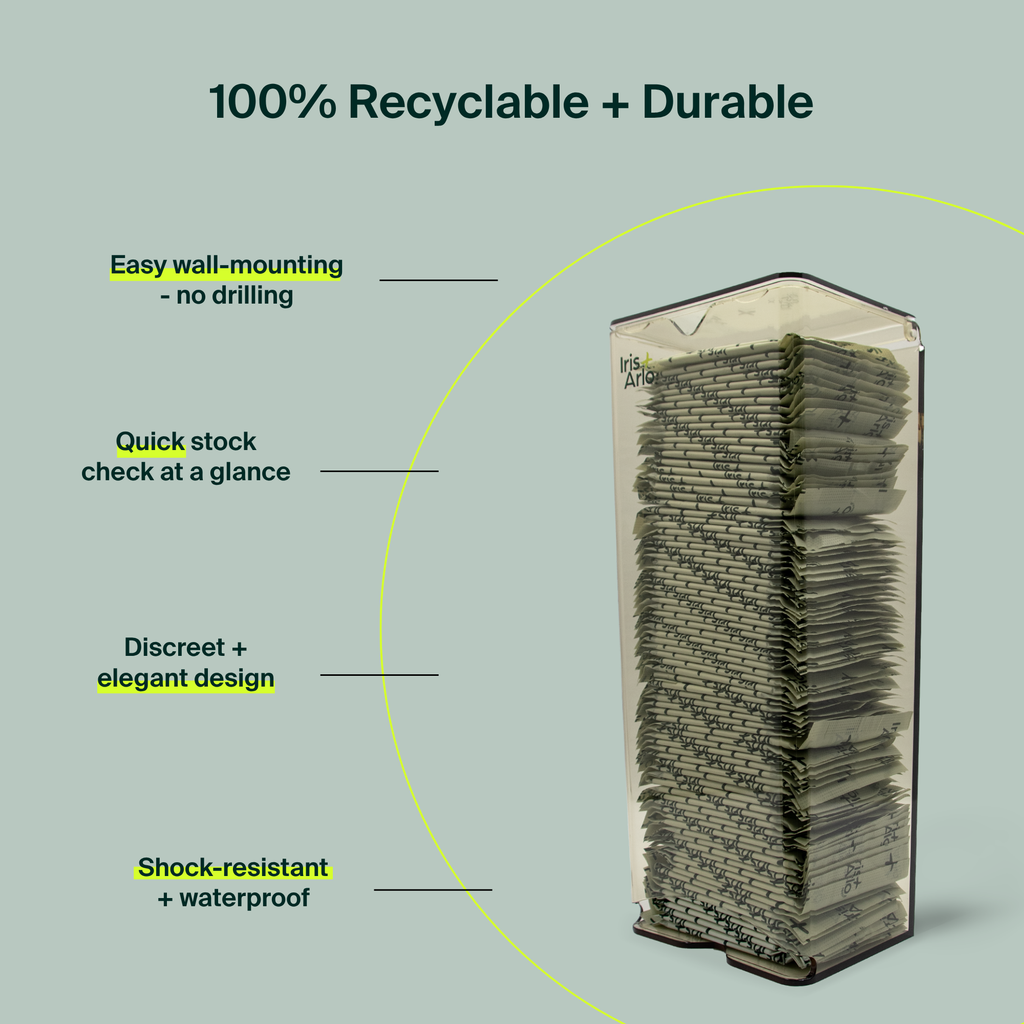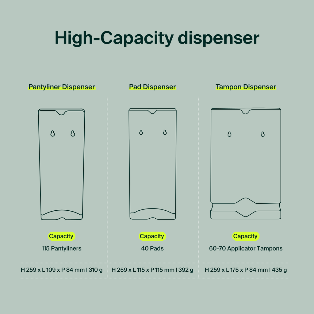 PANTYLINERS AREN'T INCLUDED IN THE PRICE. Designed with a sleek and modern aesthetic, our pantyliner dispensers are sturdy, sustainable products that contribute to the circular economy. With greater storage capacity than cabin dispensers, they are ideal for high-traffic washrooms or workplaces seeking to reduce refill frequency. For complete convenience and savings, choose the trio set to offer more menstrual product options for your staff.