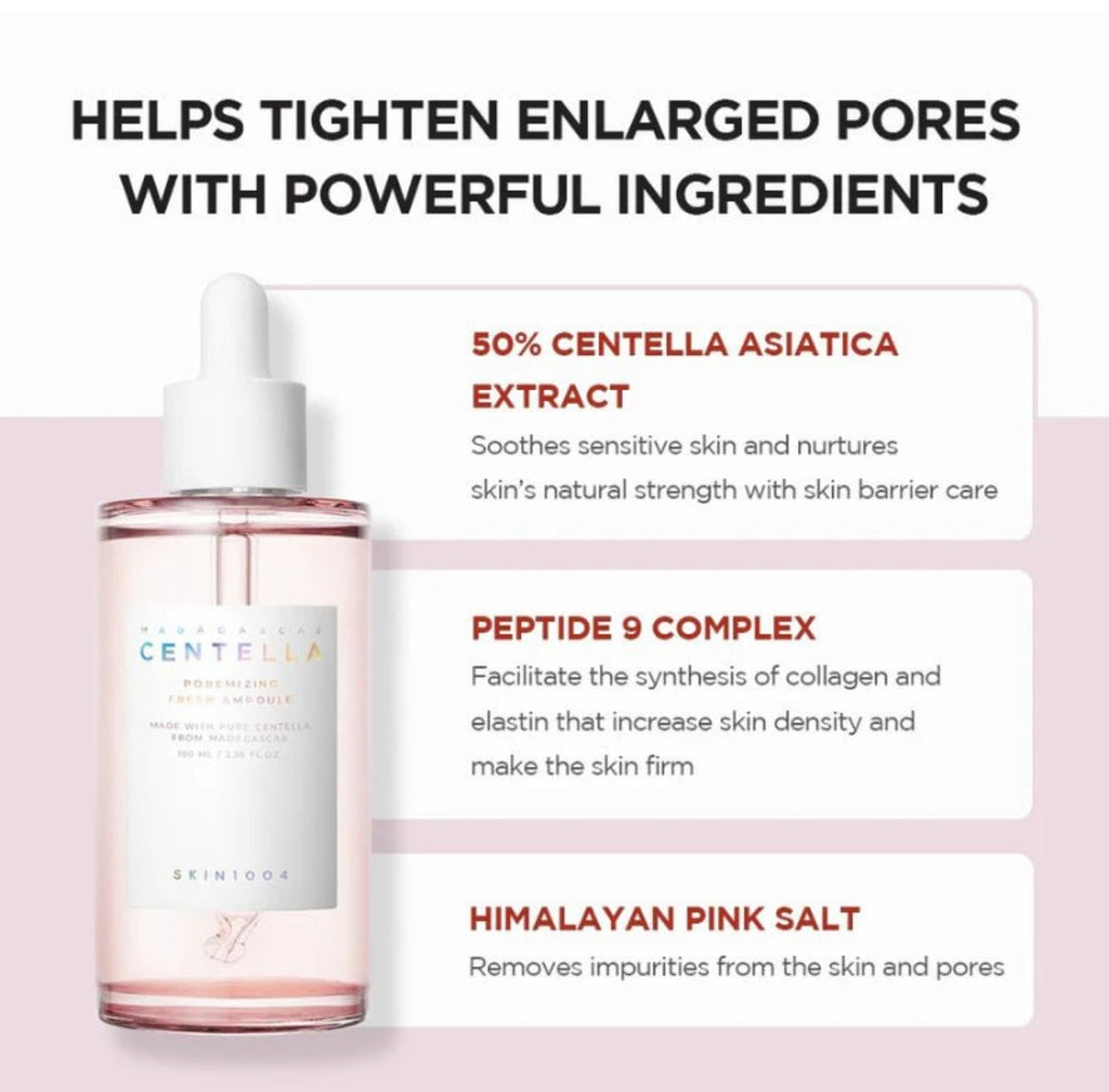 Refine and revitalize your skin with the SKIN1004 Madagascar Centella Poremizing Fresh Ampoule (100ml). This lightweight serum deeply cleanses and purifies pores while delivering soothing hydration with Madagascar Centella Asiatica. Enriched with Pink Himalayan Salt and a Peptide-9 Complex, it strengthens the skin barrier, improves elasticity, and minimizes the appearance of enlarged pores for a smooth, balanced, and refreshed complexion.